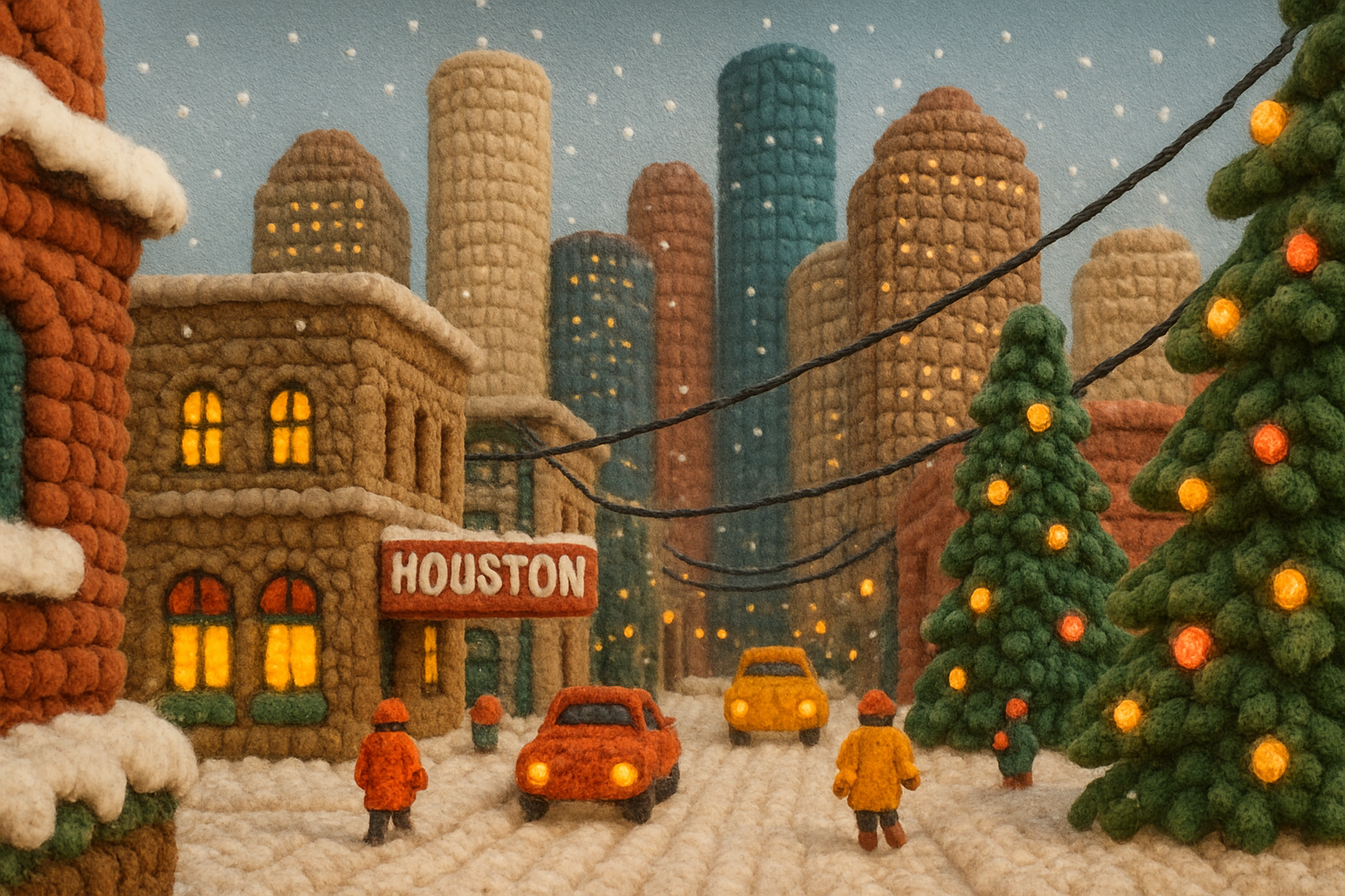 /Collection: /by davooda/Type: PNG/A whimsical downtown Houston scene depicting buildings, cars, and trees, all crafted from thick wool yarn. The atmosphere is festive with soft colors, light snowfall, and tiny figures enjoying the holiday ambiance.
