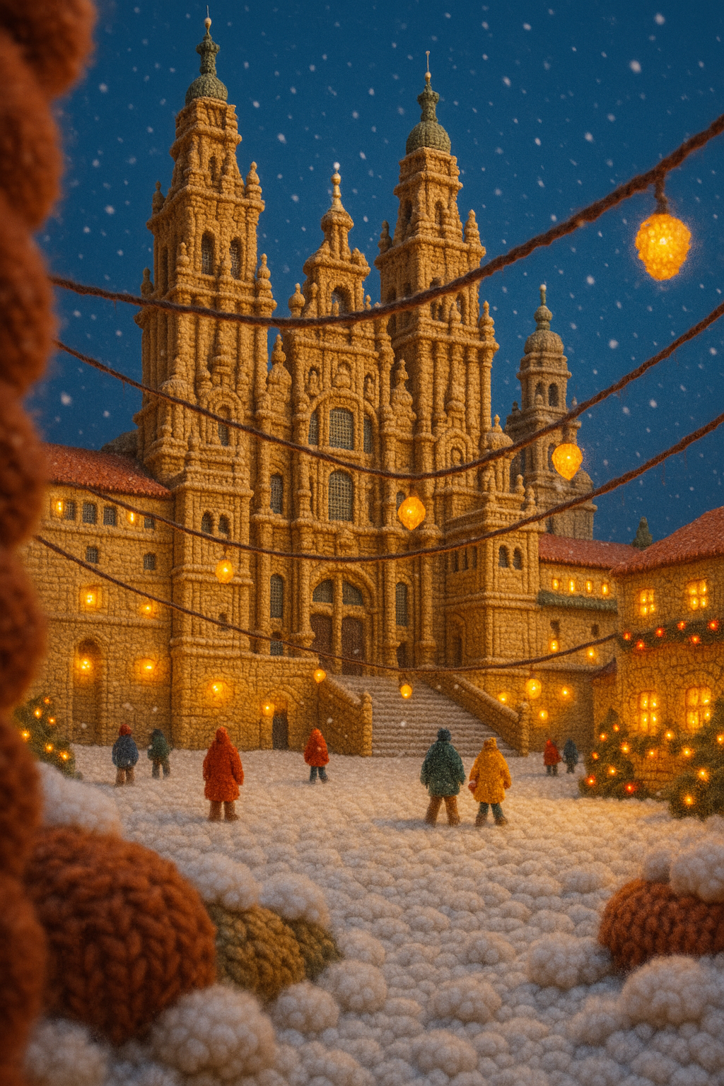 A whimsical 3D representation of Santiago Cathedral, crafted from yarn-like textures. The scene features softly blurred foreground, vibrant holiday lights, and gentle snowfall, creating a cozy winter atmosphere.