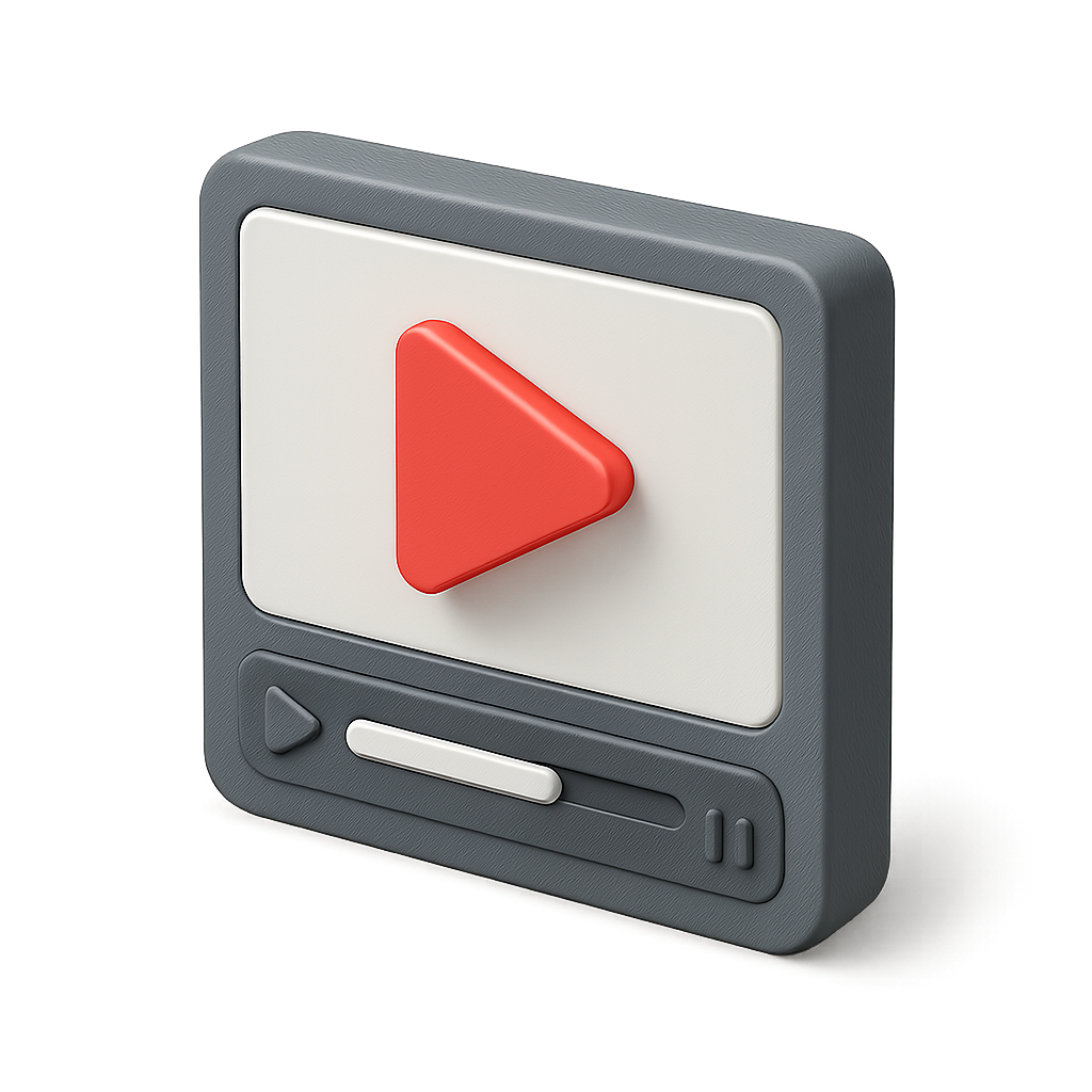 /Collection: /by davooda/Type: PNG/A sleek 3D video playback icon featuring a prominent red play button on a gray and white interface. The design showcases a three-quarter view with a modern isometric style.