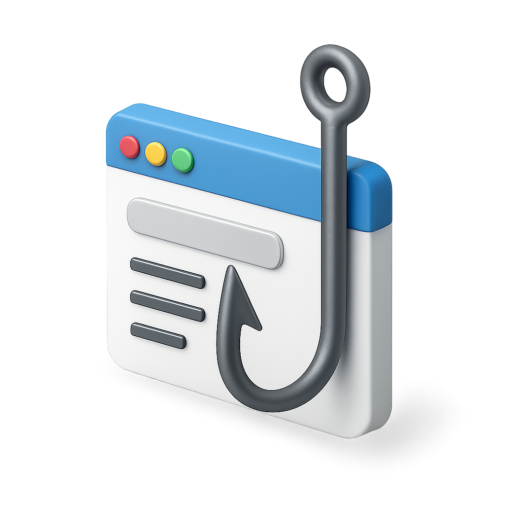/Collection: /by davooda/Type: PNG/A 3D icon featuring a fishing hook integrated into a web browser interface. The design showcases a browser window with colorful buttons and a stylized hook, all presented in a volumetric isometric view.