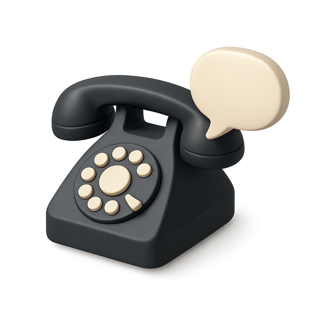 A sleek 3D telephone icon featuring a classic design with a speech bubble. The phone is shown in a three-quarter view, exuding a modern and volumetric appearance.