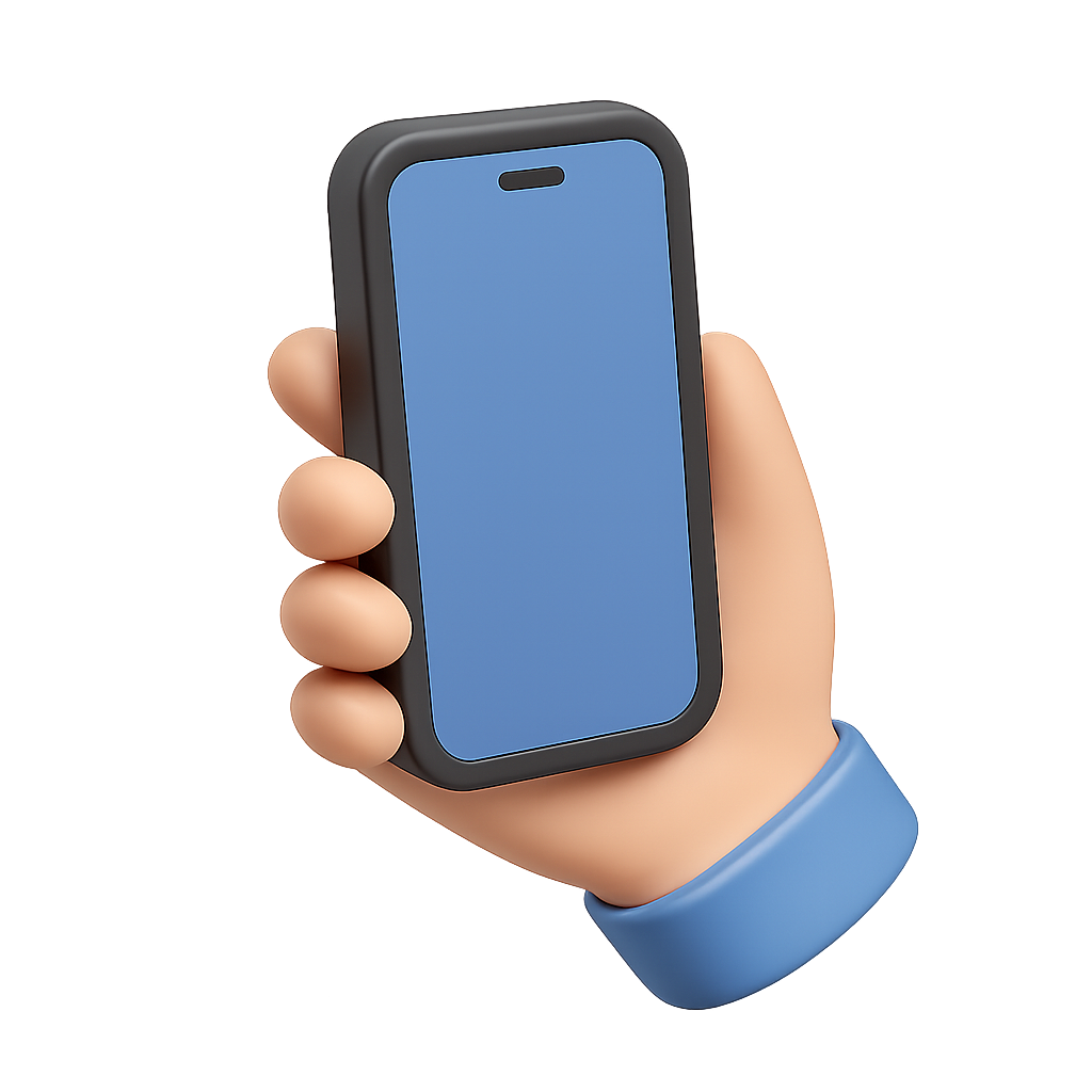 A stylized 3D icon of a smartphone held in a hand, showcasing a simple design with a transparent background. The smartphone features a blue screen and a black frame, viewed from a three-quarter angle.