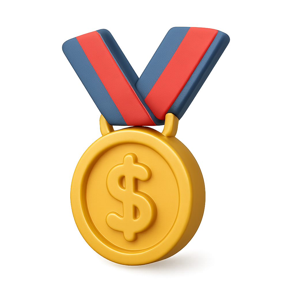A vibrant 3D medal featuring a prominent dollar sign, suspended from a ribbon with red and blue stripes. The design is isometric with a transparent background, enhancing its volumetric appearance.