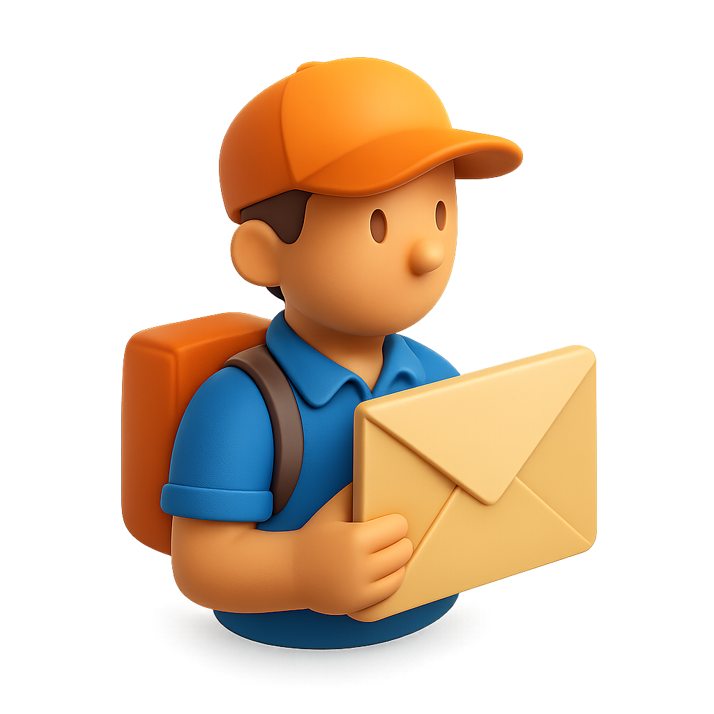A stylized 3D icon of a courier character holding an envelope, wearing an orange cap and blue shirt, with a backpack. The design features a transparent background and a volumetric, isometric perspective.