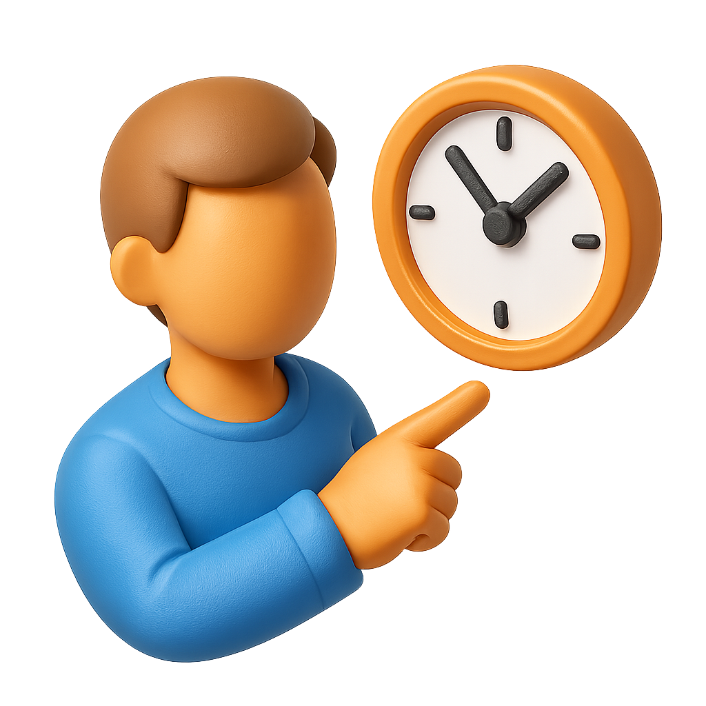 A stylized 3D icon featuring a person pointing at a clock, designed with a transparent background and a three-quarter isometric view. The clock is vibrant and volumetric.