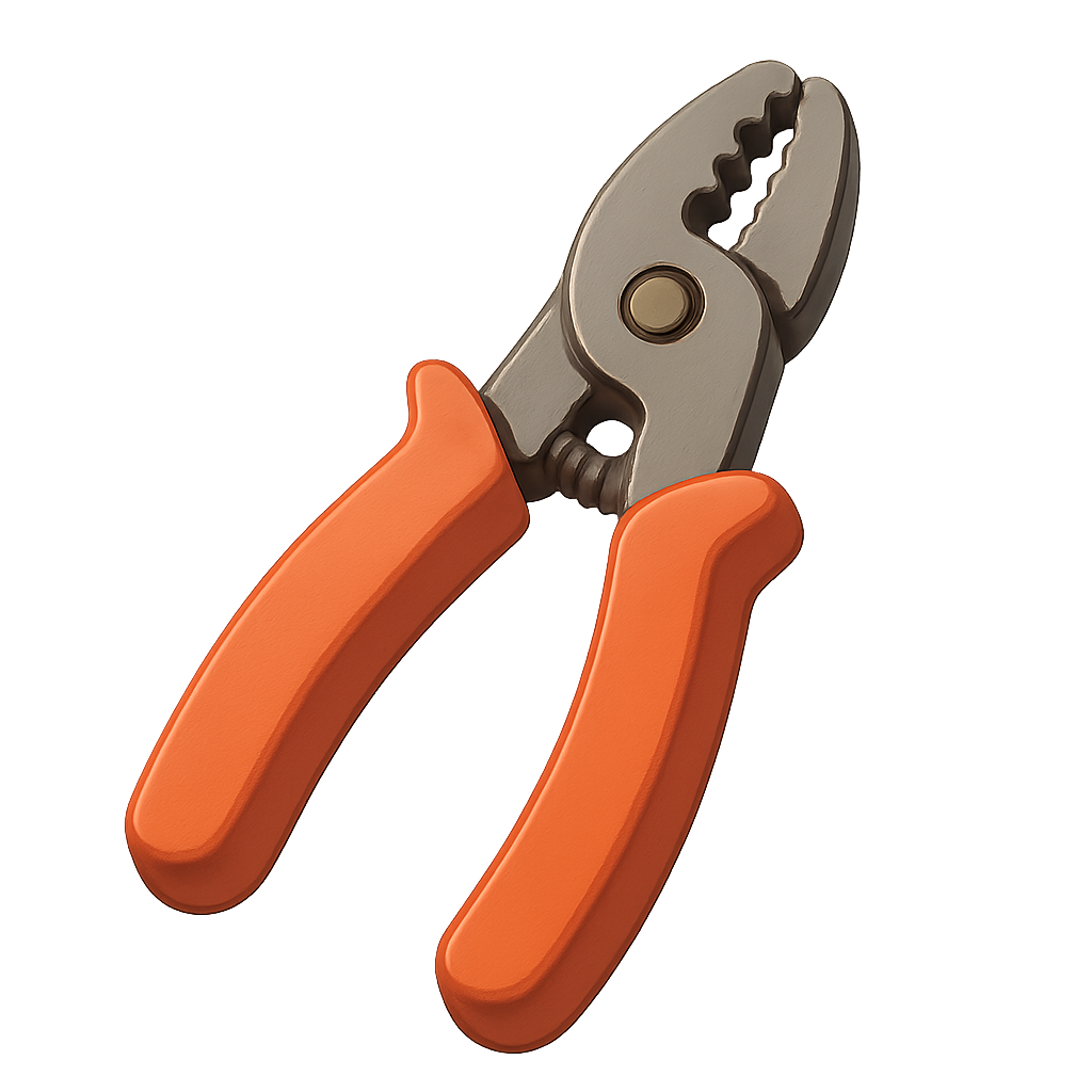 A stylized 3D wire stripper pliers icon showcasing a metallic finish with orange rubber grips, viewed in a three-quarter angle against a subtle gradient background.