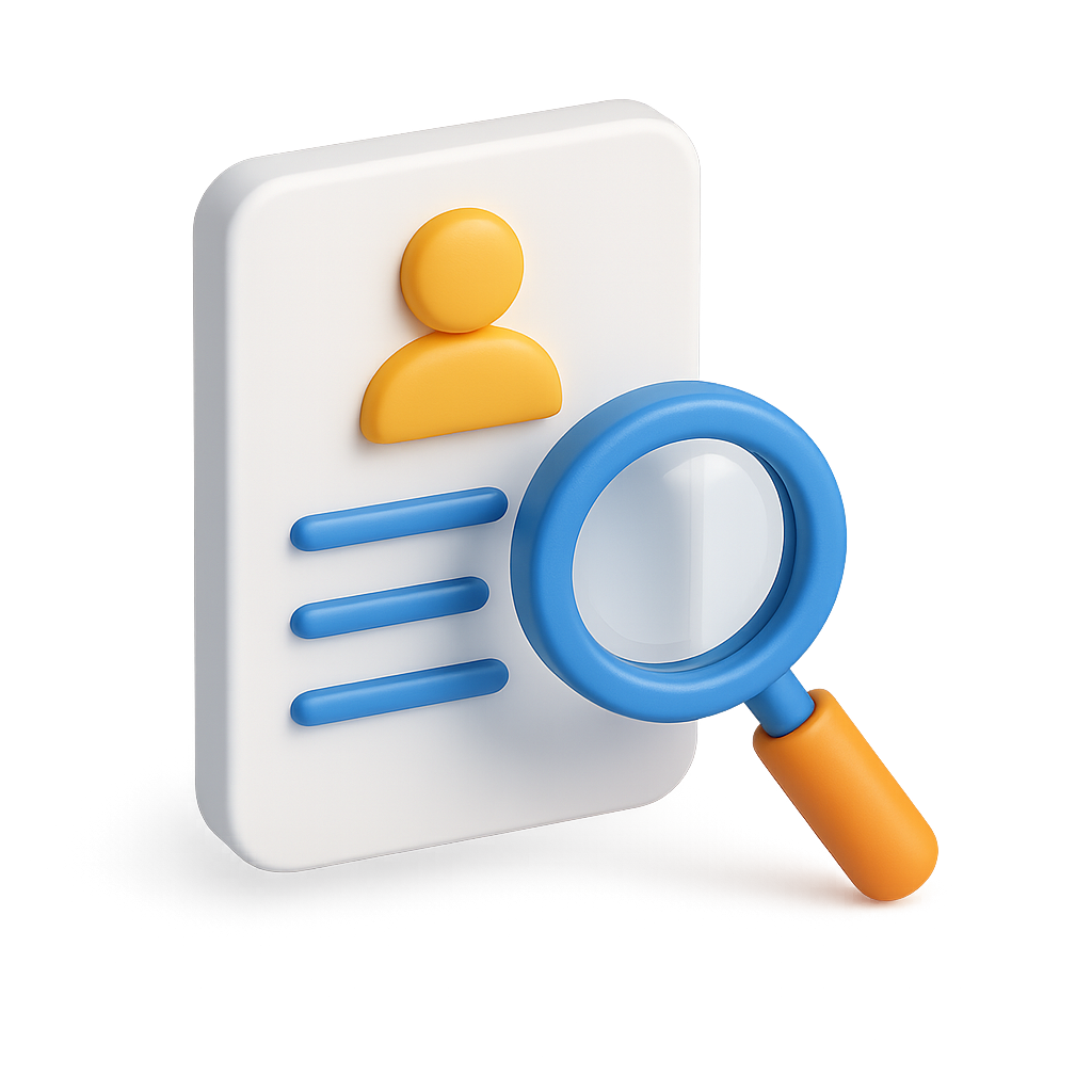 /Collection: /by davooda/Type: PNG/A 3D icon depicting a resume with a magnifying glass, showcasing a transparent background and an isometric design. The icon has a modern and volumetric feel, ideal for job search applications.