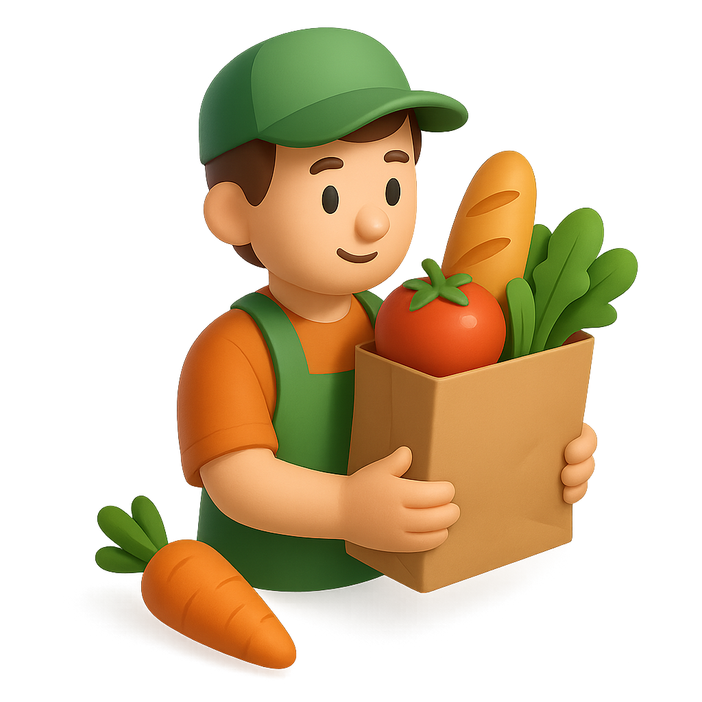 A cheerful 3D grocer character holds a carton filled with fresh groceries including a tomato, lettuce, and a loaf of bread. The icon has a vibrant and playful design, perfect for food-related themes.