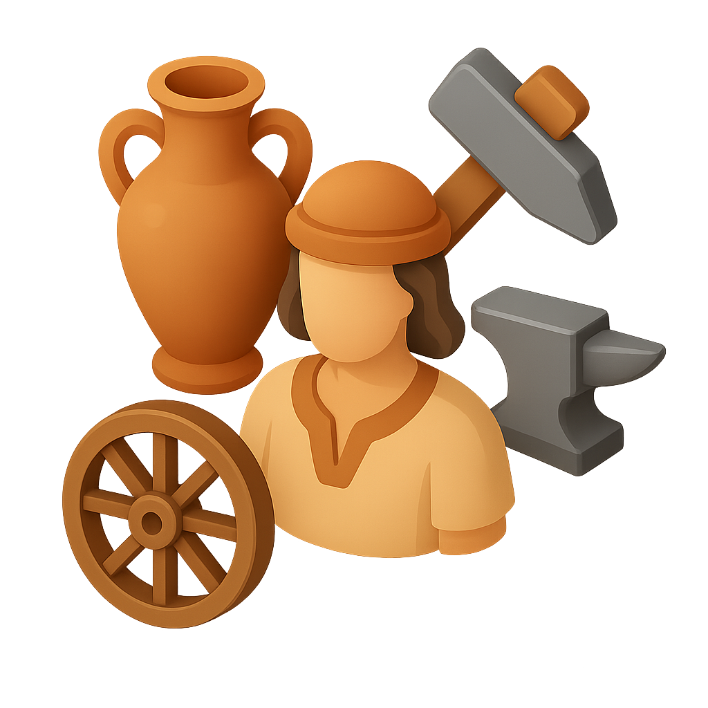 /Collection: /by davooda/Type: PNG/A 3D icon featuring elements representing ancient professions, including a pot, hammer, anvil, and a figure in traditional attire, all designed with a three-quarter view and volumetric feel.
