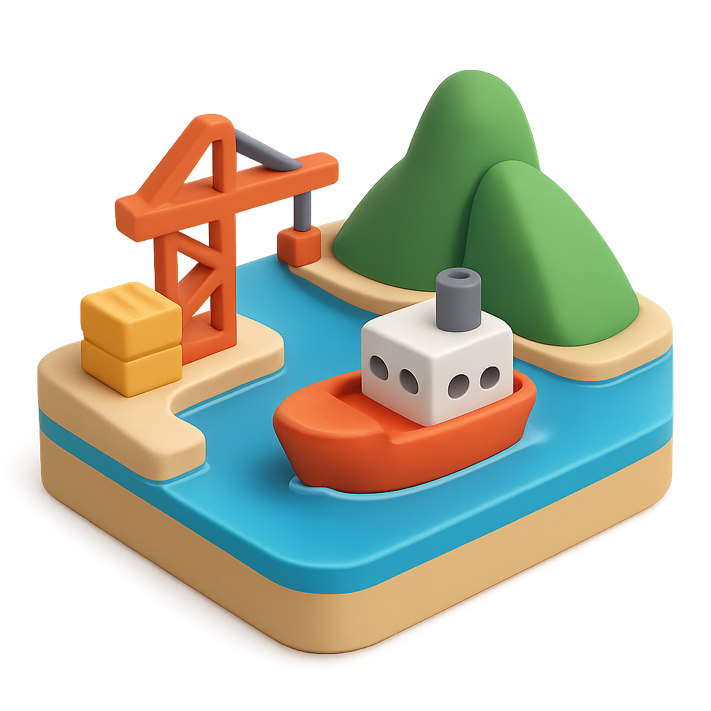 A colorful 3D icon depicting a stylized harbor scene. It features a small boat on water, a crane, and green hills in the background, all presented with a vibrant isometric design.