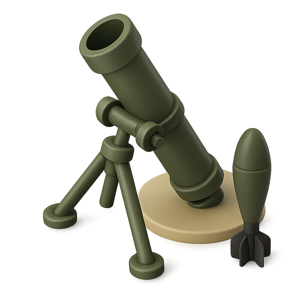 /Collection: /by davooda/Type: PNG/A stylized 3D illustration of a mortar on a tripod, accompanied by a shell. The design features a three-quarter perspective with a smooth, volumetric feel against a soft gradient background.
