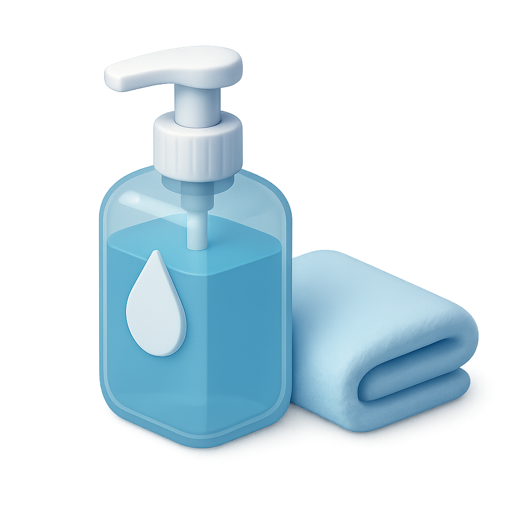 /Collection: /by davooda/Type: PNG/A 3D icon featuring a hand sanitizer bottle with a pump and a blue towel. The design is isometric, showcasing a translucent background and volumetric details for a modern look.