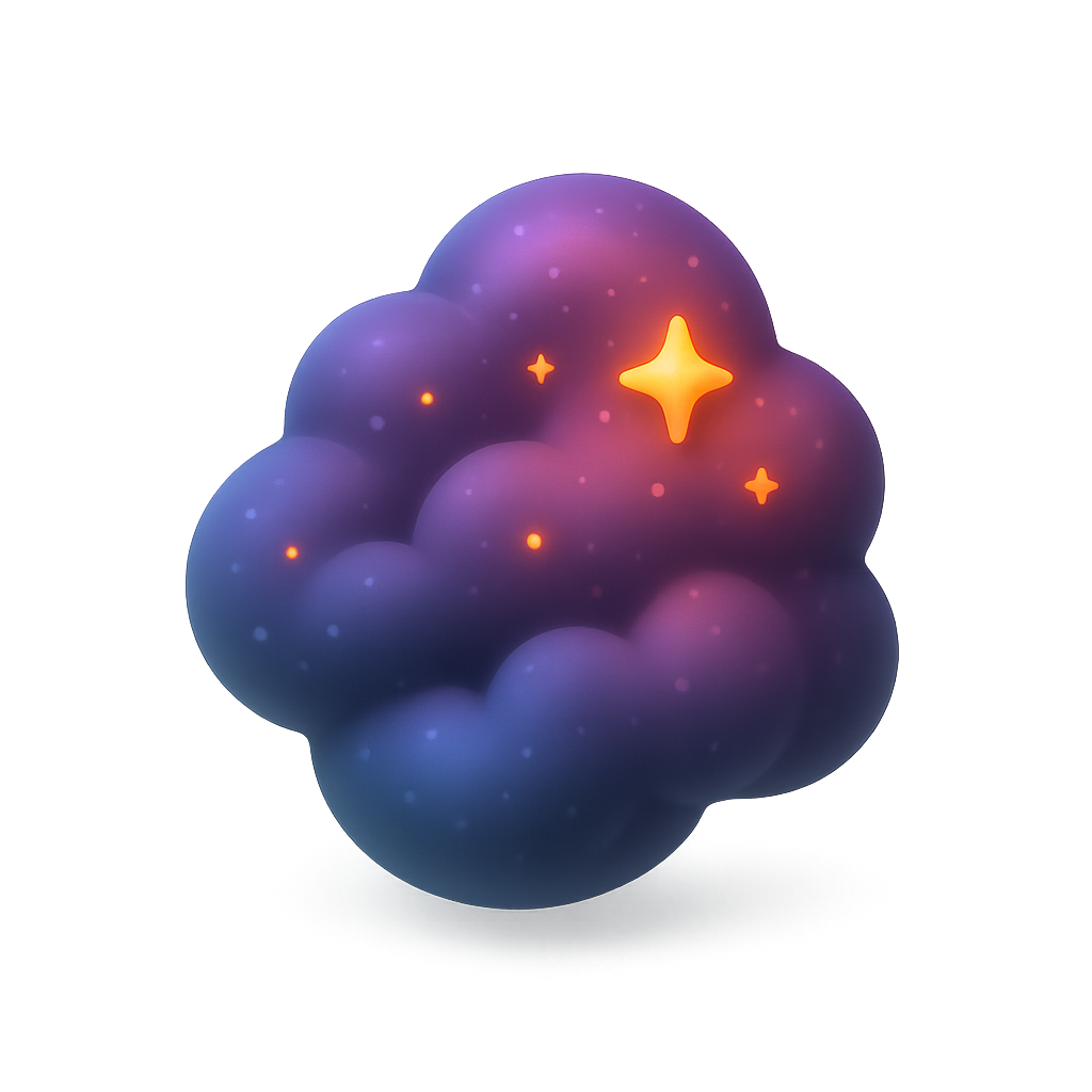 A visually appealing 3D nebula cloud formation showcasing a blend of purple and blue hues, accented with glowing stars. The design features a smooth, volumetric look with an isometric perspective.