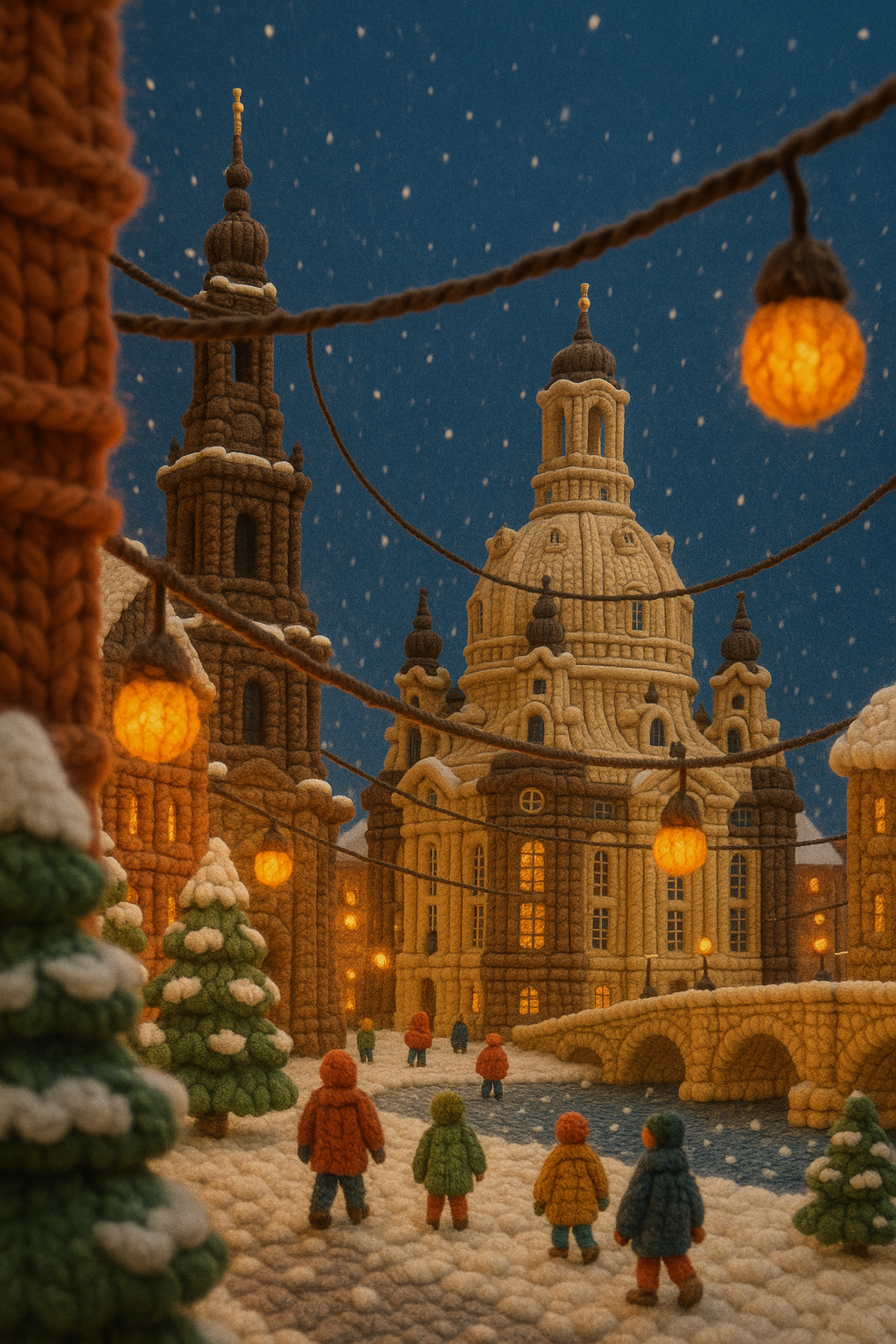 A vibrant, knitted scene depicting the city centre of Dresden, featuring fluffy structures resembling buildings, snowflakes gently falling, and tiny figures strolling under warm lights.