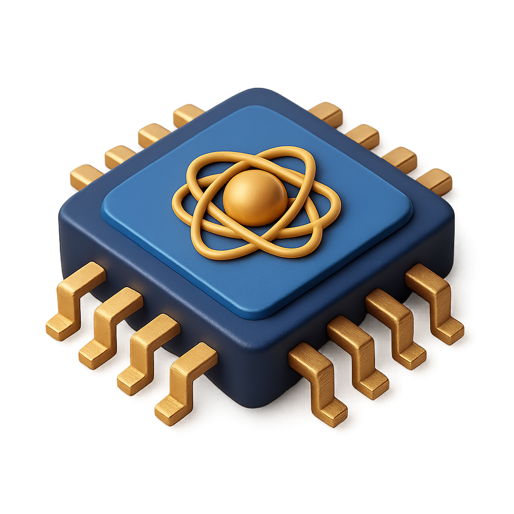 A 3D icon of a quantum computer chip featuring a blue square base with a golden atomic symbol on top. The design showcases an isometric, volumetric style, emphasizing depth and dimension.