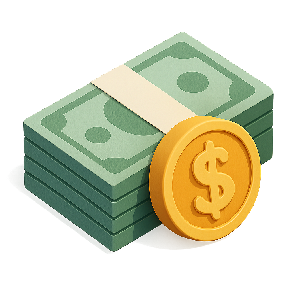 A visually striking 3D representation of a dollar icon placed next to a stack of cash. The design features a vibrant yellow dollar symbol and a green money stack, all on a transparent background.