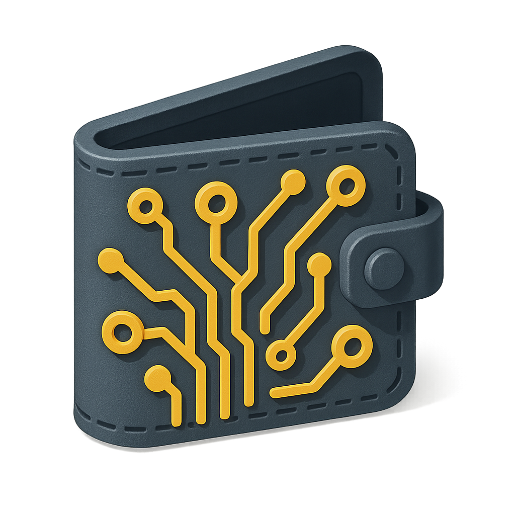 A sleek 3D wallet icon featuring a circuit design in bright yellow against a dark grey background. The wallet is shown in a three-quarter view, enhancing its volumetric appearance.