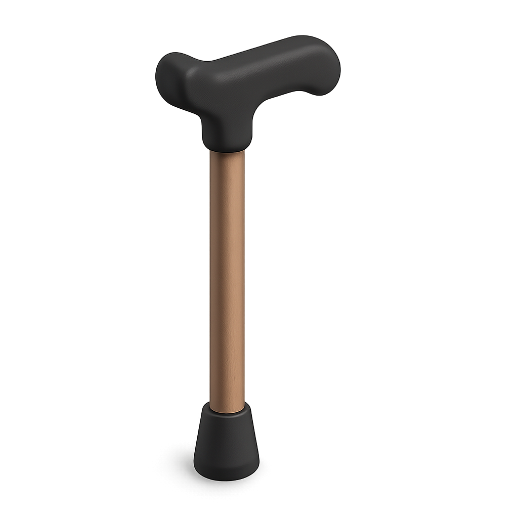 A sleek 3D walking stick icon featuring a black grip and a copper shaft. The isometric view highlights its volumetric design against a subtle gradient background.