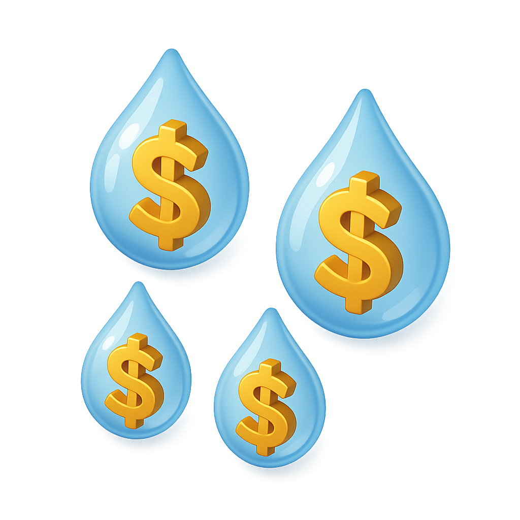 Four 3D water droplets, each containing a golden dollar sign, create a visually striking design. The droplets have a glossy appearance, enhancing their three-dimensional effect.