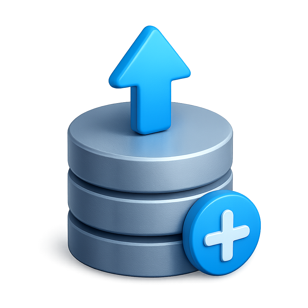 A 3D icon featuring a stylized database with a blue upload arrow and a plus sign, designed in a sleek isometric style with a transparent background.