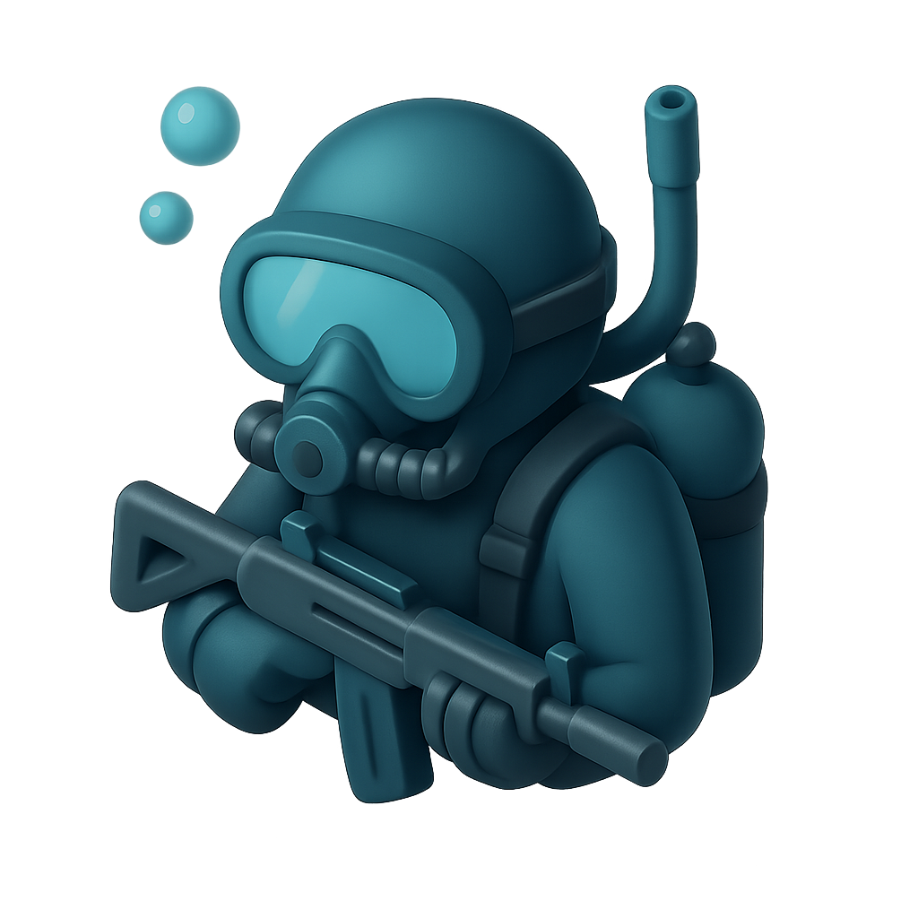A stylized 3D icon of a Navy Seal in underwater gear, holding a rifle. The design features a three-quarter view with a transparent background, emphasizing a volumetric and isometric style.