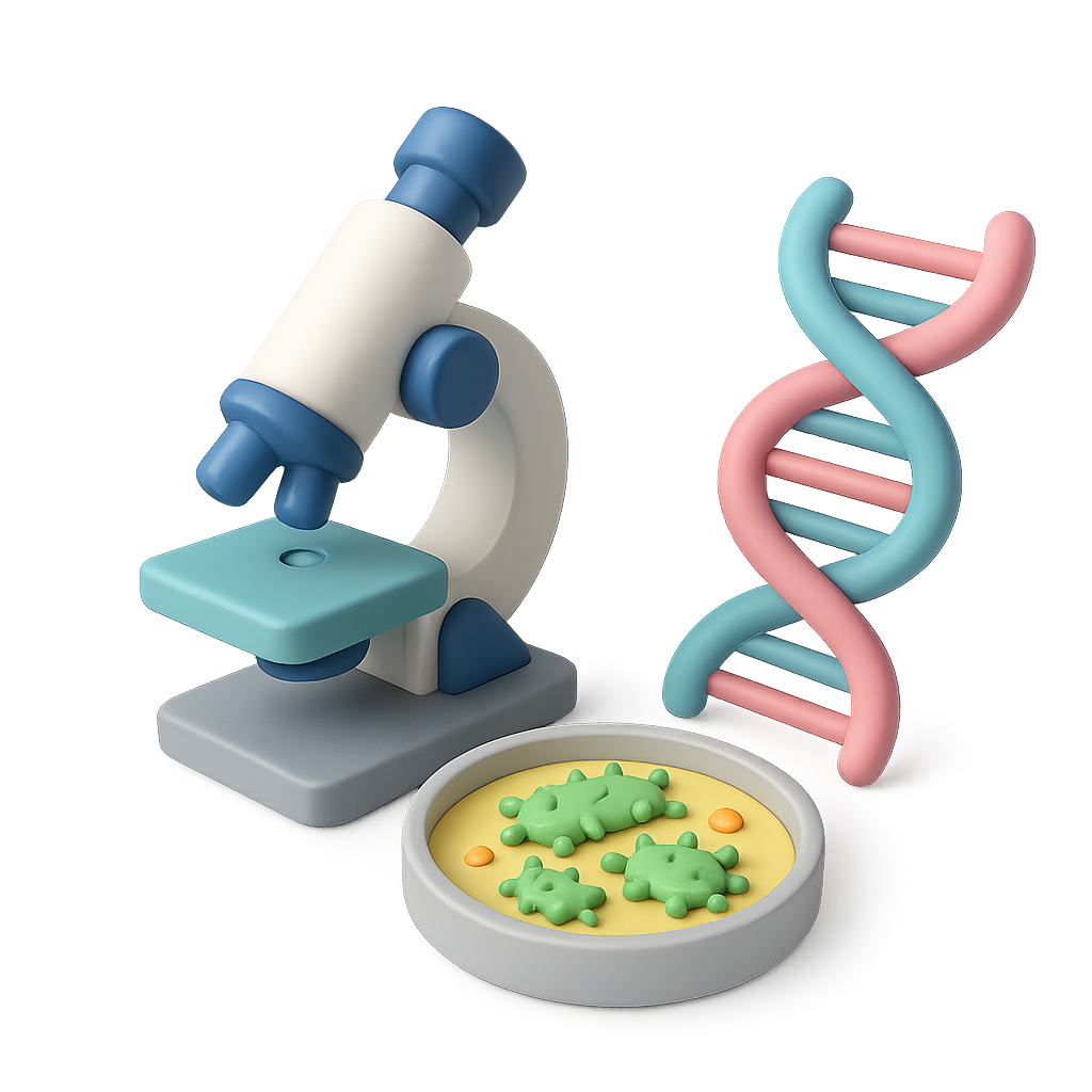 /Collection: /by davooda/Type: PNG/A vibrant 3D icon featuring a microscope, a petri dish with green bacteria, and a DNA strand, all designed with a playful, isometric style suitable for synthetic biology themes.