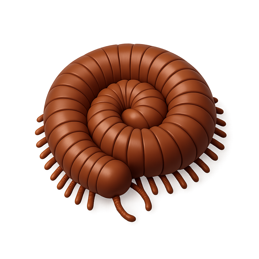 A stylized 3D representation of a millipede curled into a spiral shape. The design features a smooth, brown exterior with segmented body parts, showcasing a three-quarter isometric view.