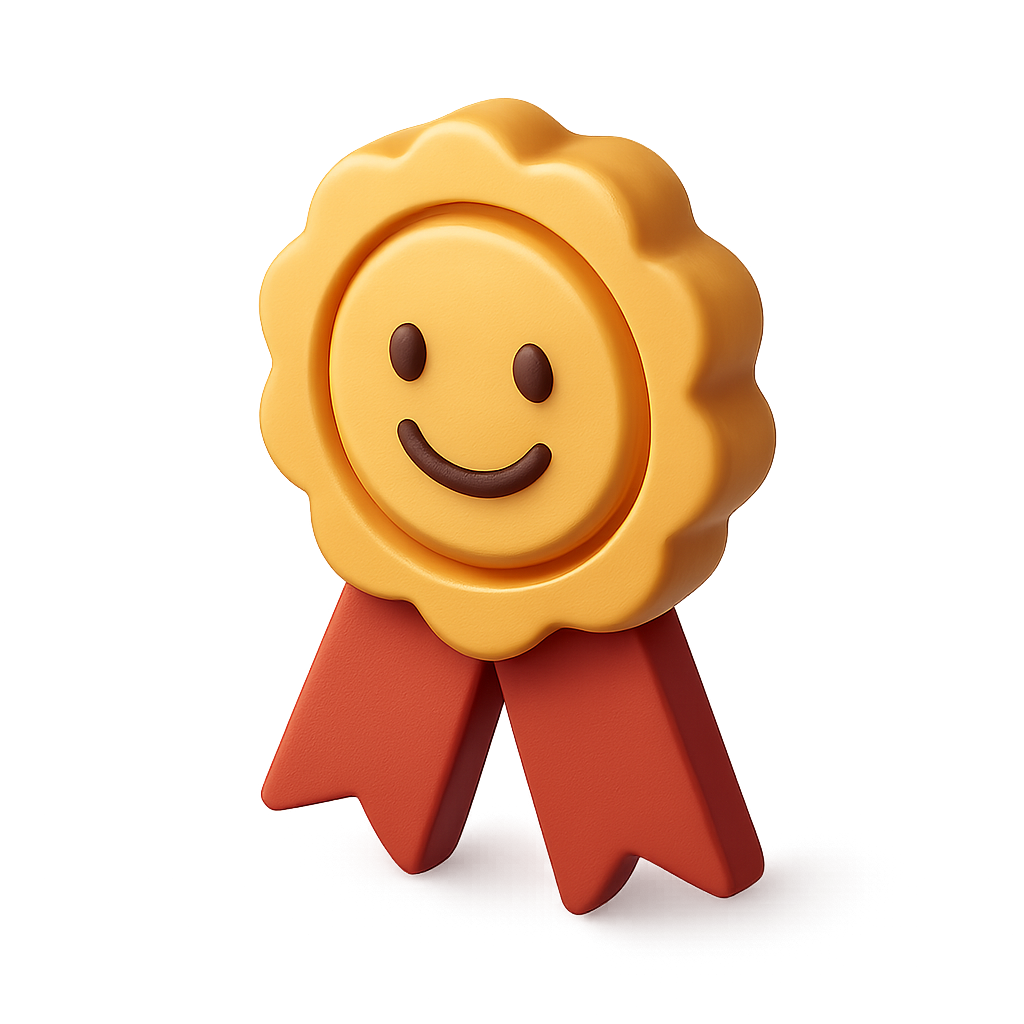 A cheerful, 3D ribbon award featuring a smiling face design. The award is depicted in a three-quarter view with a transparent background, showcasing its volumetric qualities.