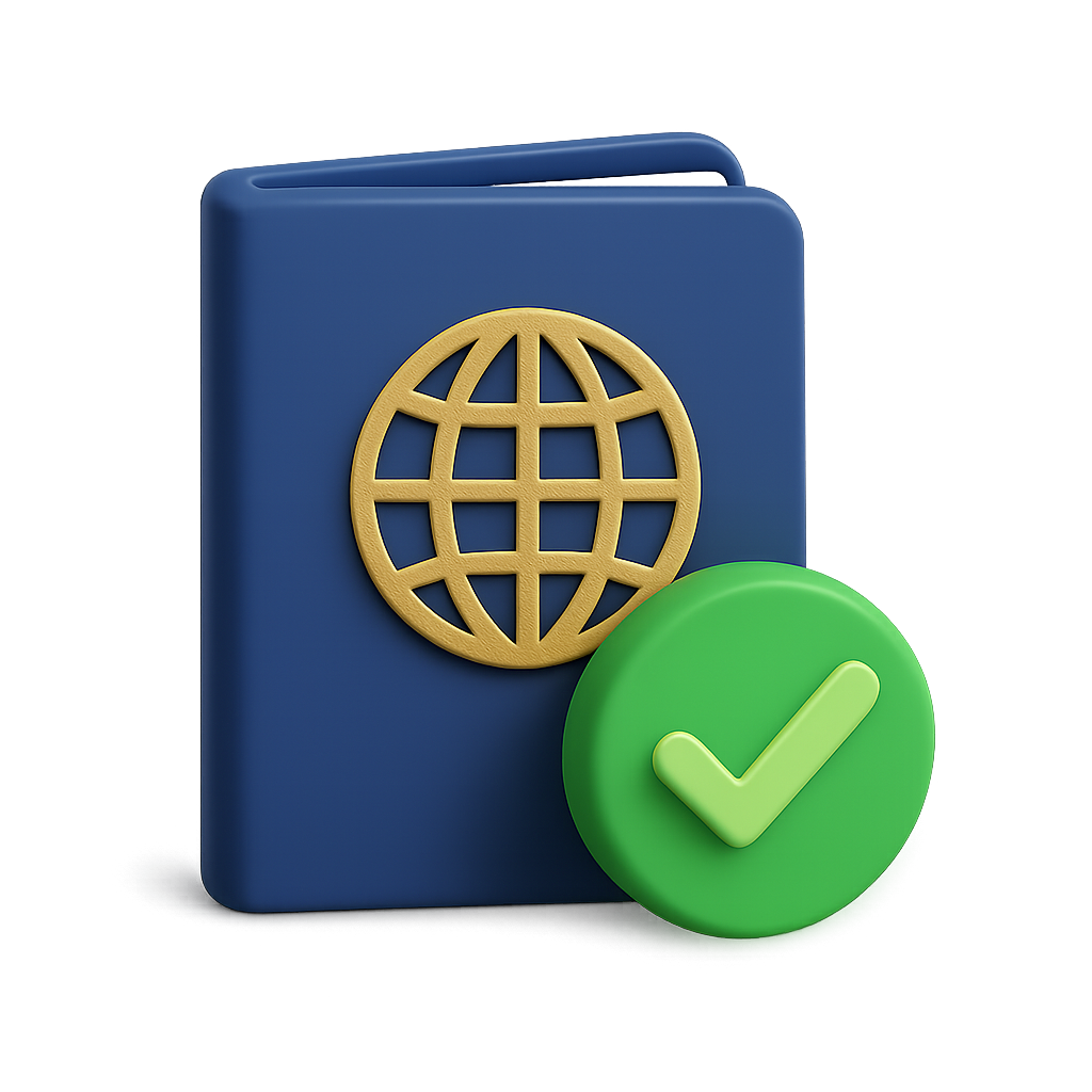 /Collection: /by davooda/Type: PNG/A stylized 3D passport icon featuring a globe design on a blue background, accompanied by a green check mark. The icon has a transparent background and showcases a volumetric isometric style.