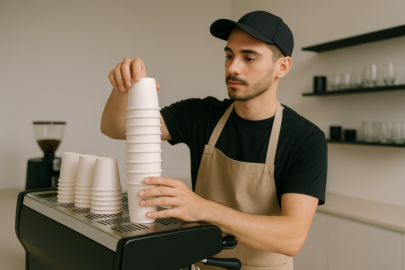 Barista Stacking Cups in Modern Minimalist Café Setting