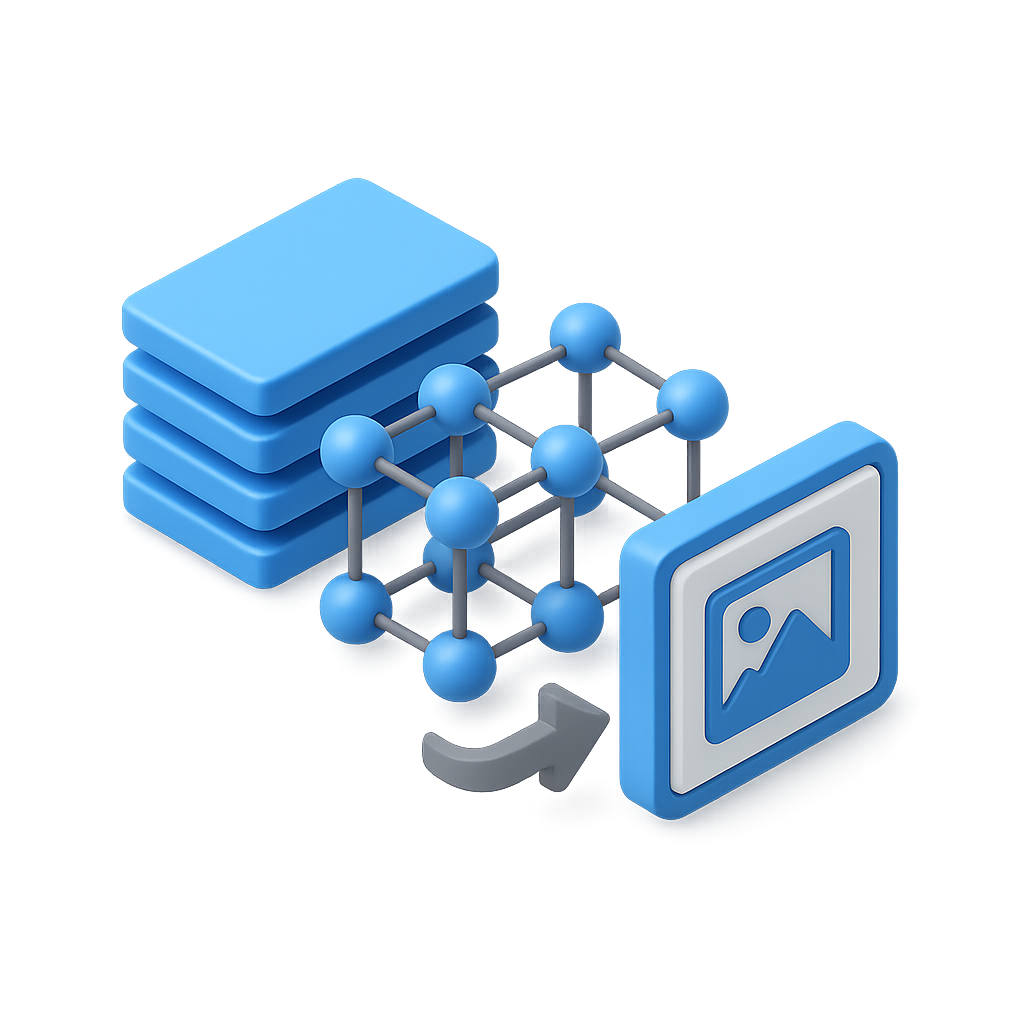 A visually appealing 3D icon representing a convolutional neural network. It features stacked blue blocks, a grid-like structure, and an image output symbol, all rendered in a three-quarter isometric view.