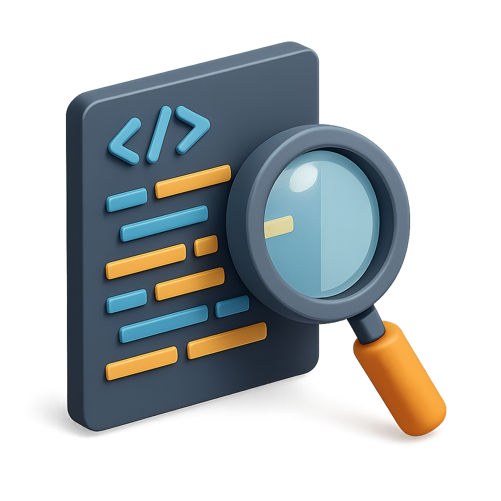 A 3D isometric icon featuring code lines represented in blue and orange, alongside a magnifying glass. The design has a transparent background and a modern, clean aesthetic.