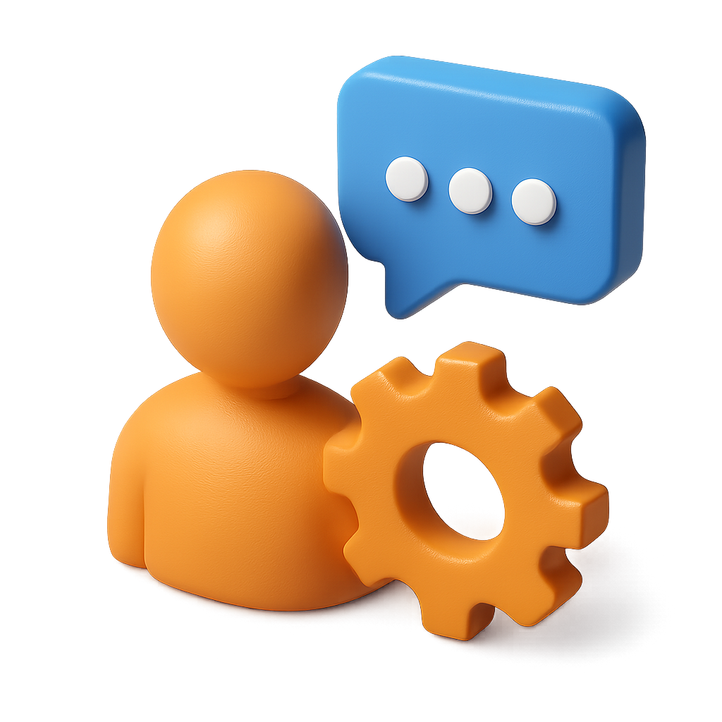 A stylized 3D icon depicting a person in orange, accompanied by a blue speech bubble with three dots and a yellow gear, all presented in an isometric view against a gradient background.