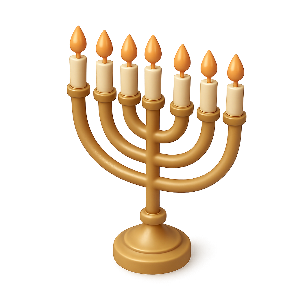 A visually appealing 3D icon of a seven-branched menorah, featuring a transparent background and a three-quarter view. The menorah has a volumetric design with glowing candles.