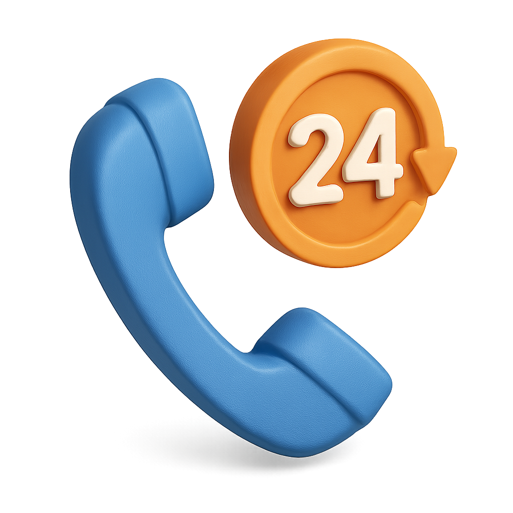 A 3D icon of a phone in blue with a circular orange badge indicating 24-hour service. The design features a transparent background and a three-quarter isometric view, emphasizing its volumetric quality.