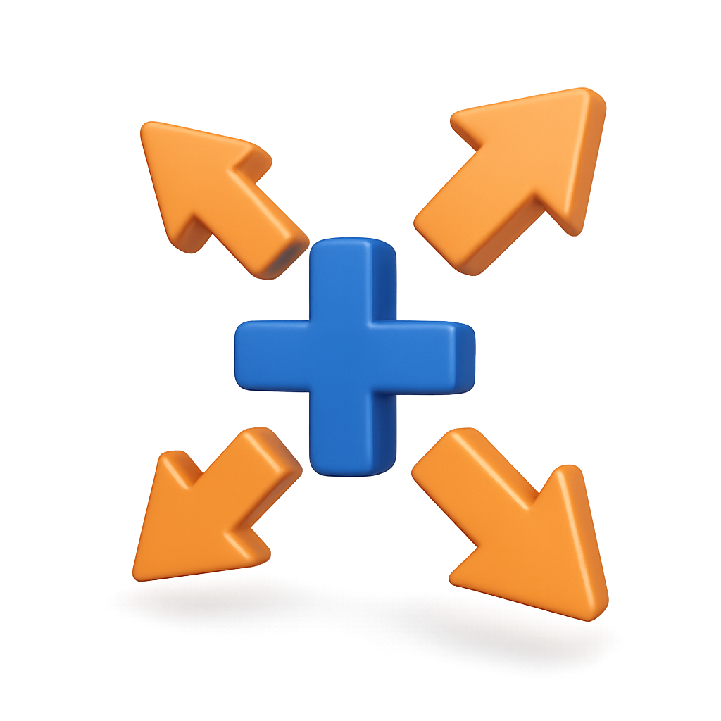 A vibrant isometric 3D design featuring multiple diagonal arrows in orange and a central blue plus sign. The arrows point in various directions, giving a dynamic feel.