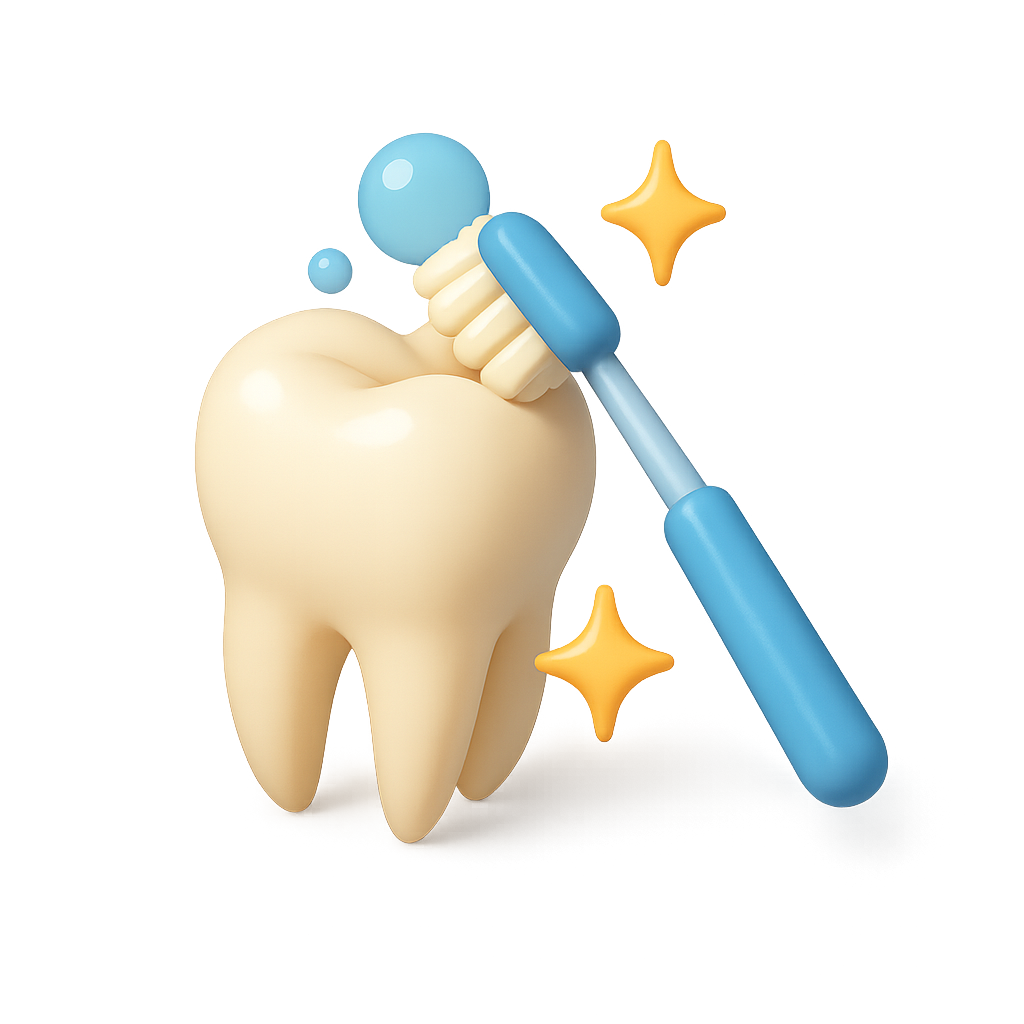 A playful 3D dental icon featuring a stylized tooth being brushed with a blue toothbrush. The design has a glossy finish and a volumetric feel, set against a gradient background.