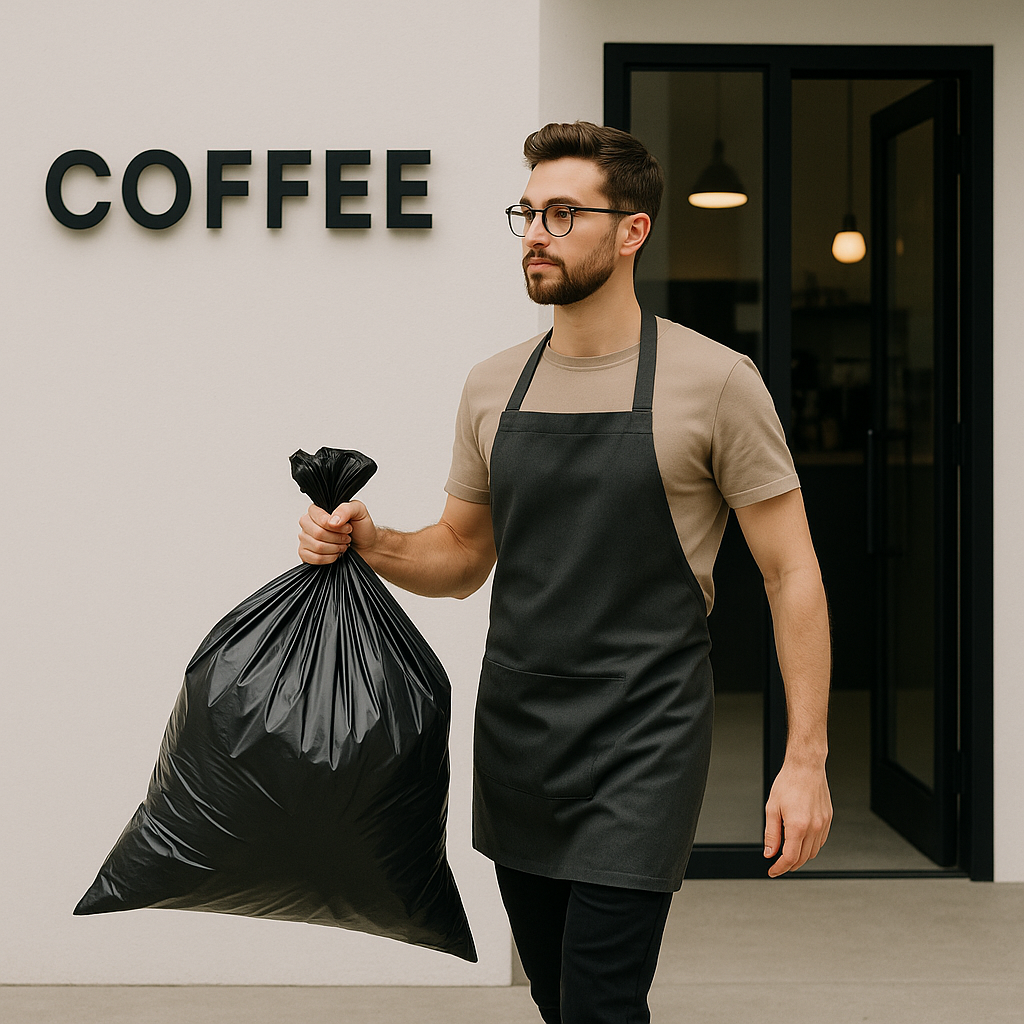 Barista Taking Out Trash in Minimalist Coffee Shop