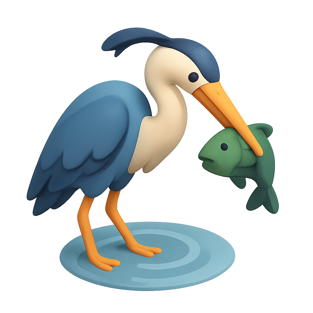 A vibrant 3D heron icon depicted in a three-quarter view, holding a fish. The design features a playful, volumetric style with a transparent background.