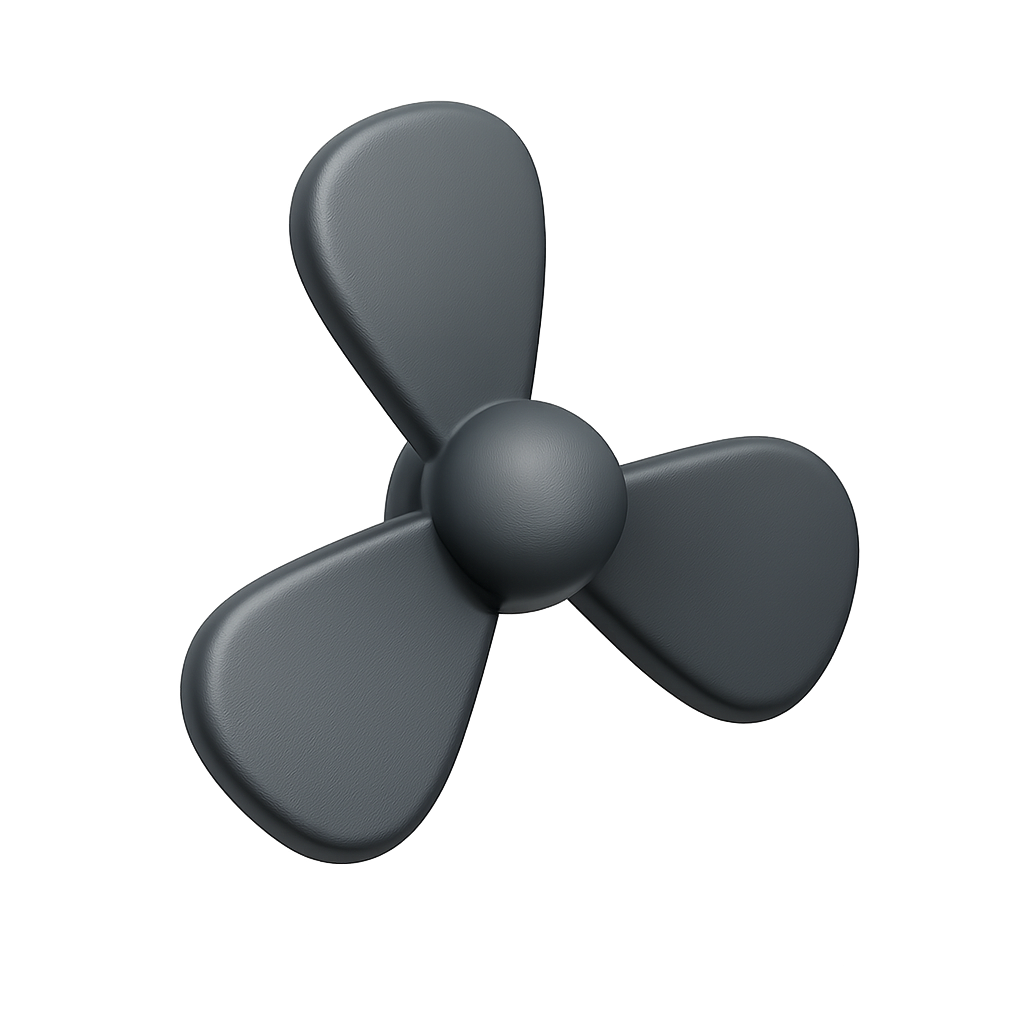 /Collection: /by davooda/Type: PNG/A sleek 3D icon of a three-blade propeller displayed in a three-quarter view. The design features a smooth, volumetric look with a dark color palette, set against a transparent background.
