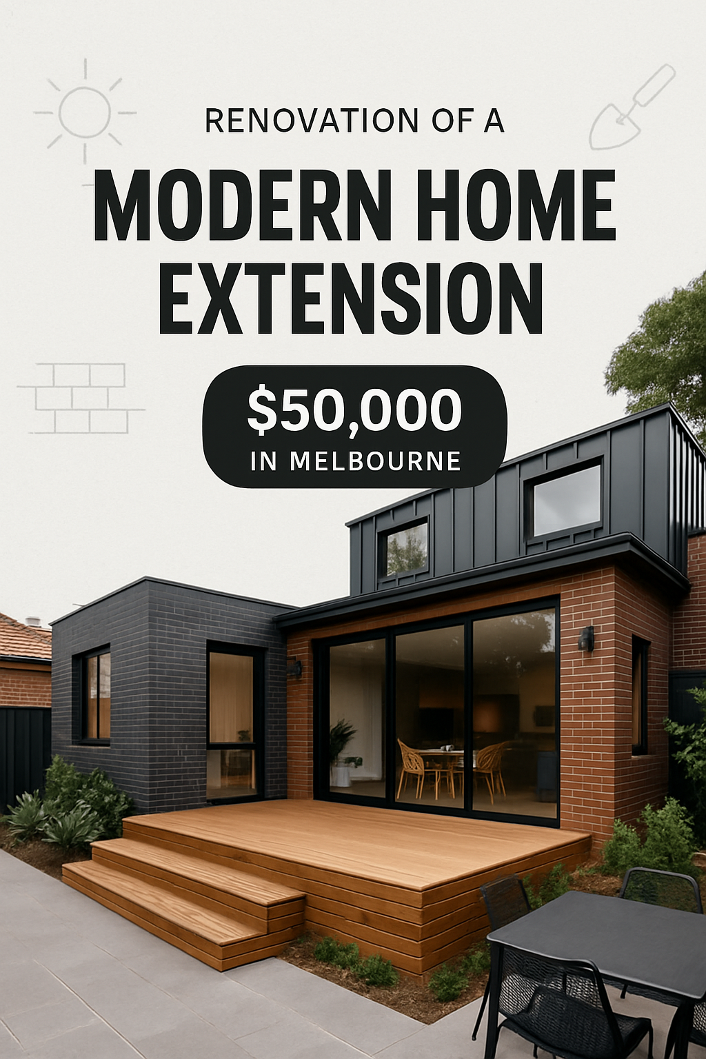 This image showcases a renovated modern home extension in Melbourne, featuring a stylish deck, patio, and courtyard area. The design highlights a balance of realism with a clean, dynamic layout.