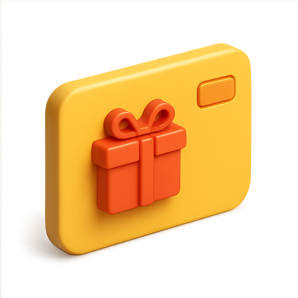 A colorful 3D gift card icon featuring a yellow background and a prominent red gift box with a bow. The design showcases a three-quarter view for a modern, isometric feel.