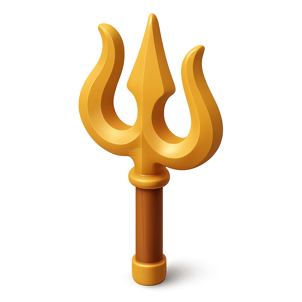 /Collection: /by davooda/Type: PNG/A detailed 3D representation of a trishula trident, featuring a golden finish and a three-quarter isometric view. The design emphasizes volume and depth, set against a transparent background.