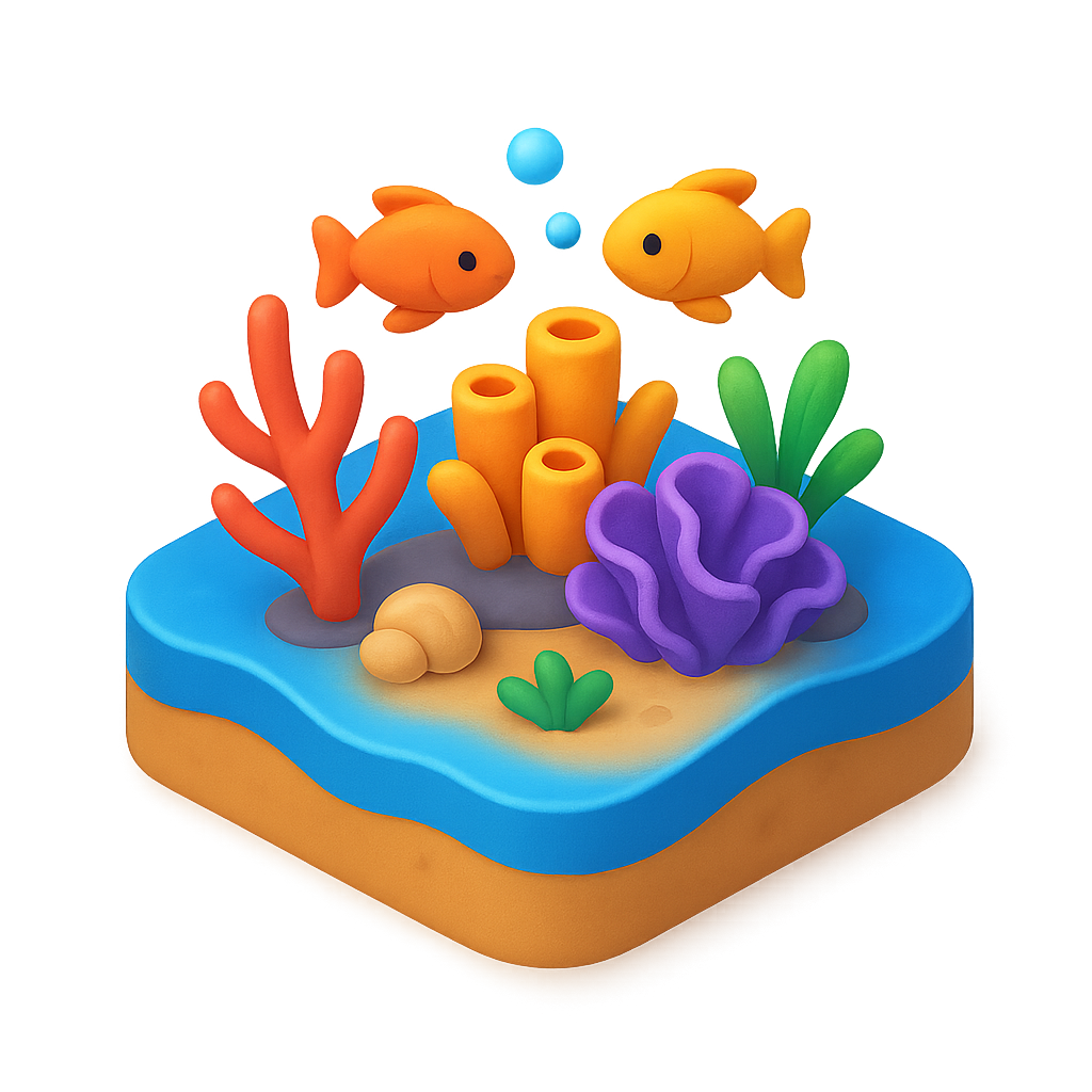 /Collection: /by davooda/Type: PNG/A vibrant 3D icon depicting a barrier reef scene with colorful coral, sea plants, and playful fish. The design features a three-quarter view and an isometric perspective, enhancing its volumetric feel.