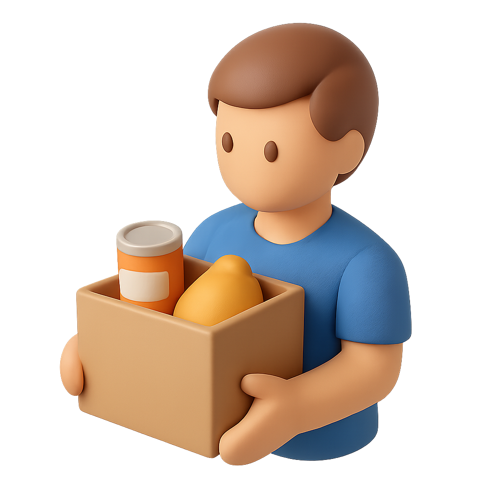 A 3D icon depicting a volunteer holding a box containing food items. The figure has a simple, stylized design with a blue shirt and a friendly expression, set against a soft gradient background.