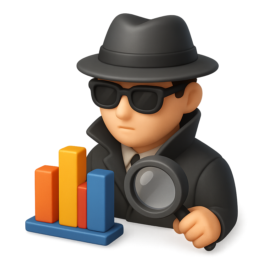 /Collection: /by davooda/Type: PNG/A 3D spy icon features a character wearing a hat and sunglasses, holding a magnifying glass, next to a colorful bar graph. The design is isometric with a transparent background.