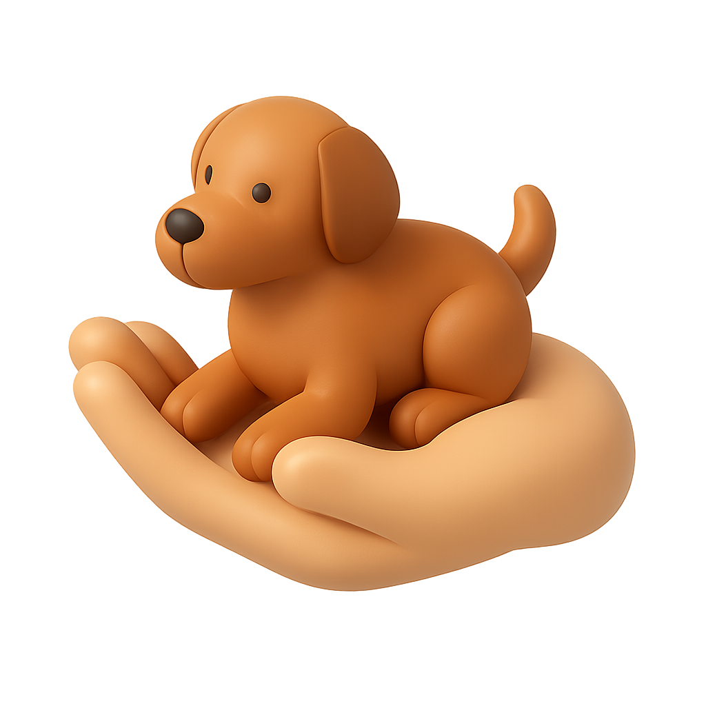 A stylized 3D illustration of a hand gently cradling a cute dog figurine. The design features a warm color palette and a soft, volumetric feel, enhancing its visual appeal.
