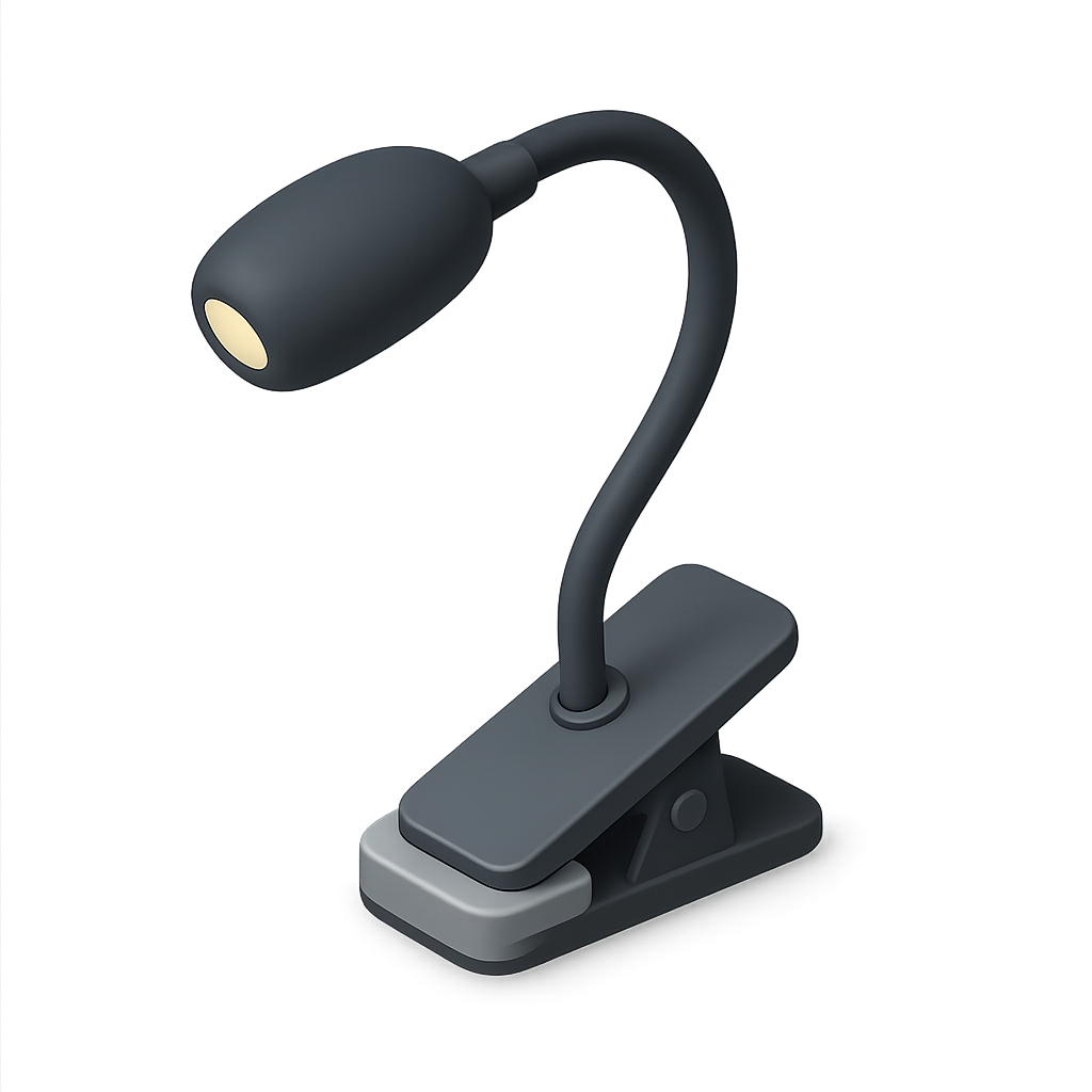 A modern clip-on reading light featuring a flexible neck and a sleek base, rendered in a three-quarter isometric view with volumetric details.