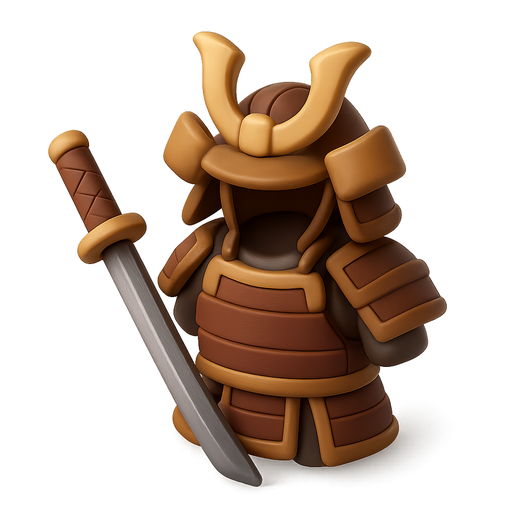 A stylized 3D icon representing samurai armor, featuring intricate detailing and a katana sword. The design showcases a three-quarter view with a warm color palette and a volumetric appearance.