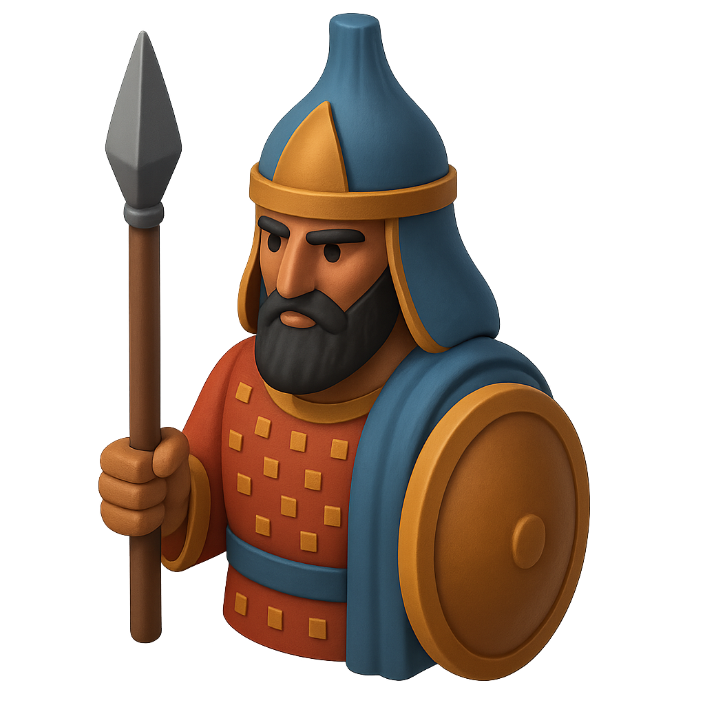 /Collection: /by davooda/Type: PNG/A stylized 3D icon depicting a Persian immortal guard holding a spear and shield. The figure features vibrant colors and a detailed design, with a transparent background.